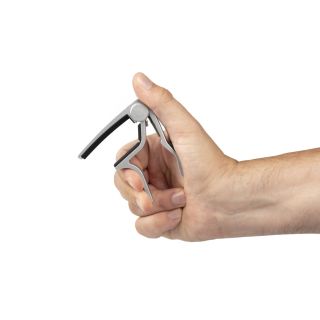Kapodastr pro akustické kytary a elektrické kytary, systém „Trigger“ (spoušť) pro rychlé a přesné usazení kapodastru na nástroj, barva: stříbrná
