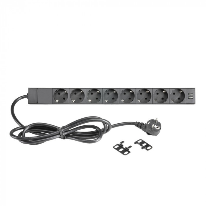 Zásuvková lišta do racku 2U, 8 x 16A 2P+G 230V Euro zásuvky, materiál: ocelový plech, přívodní kabel: PROEL HPC3025FG (3 x 2.5 mm2) 1.5 m, zavřený zadní panel
