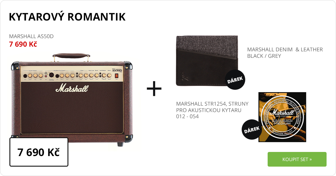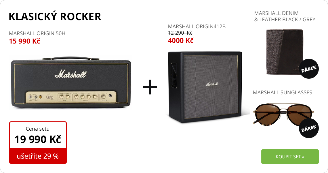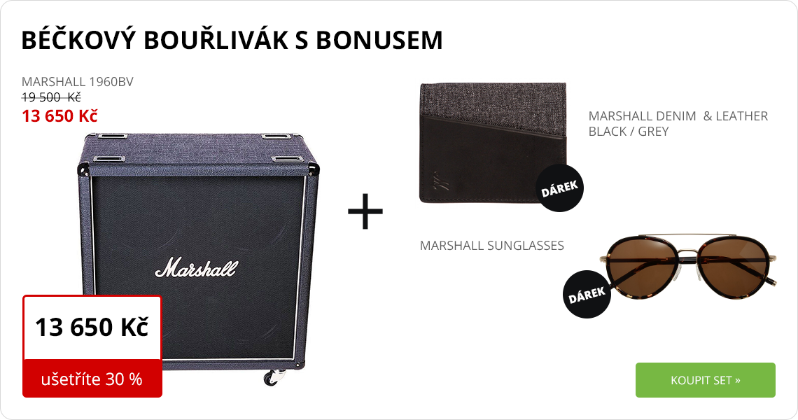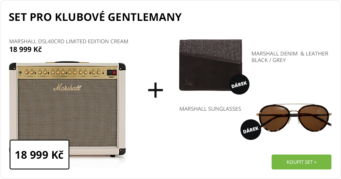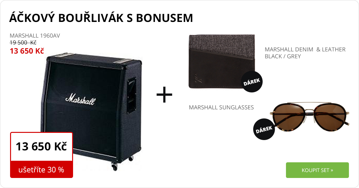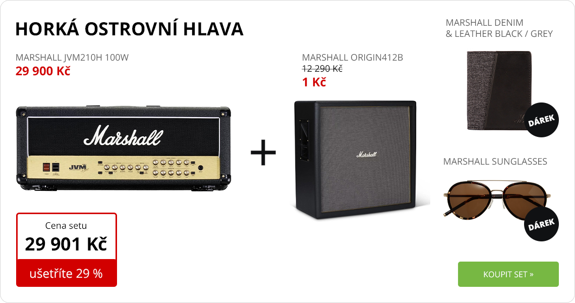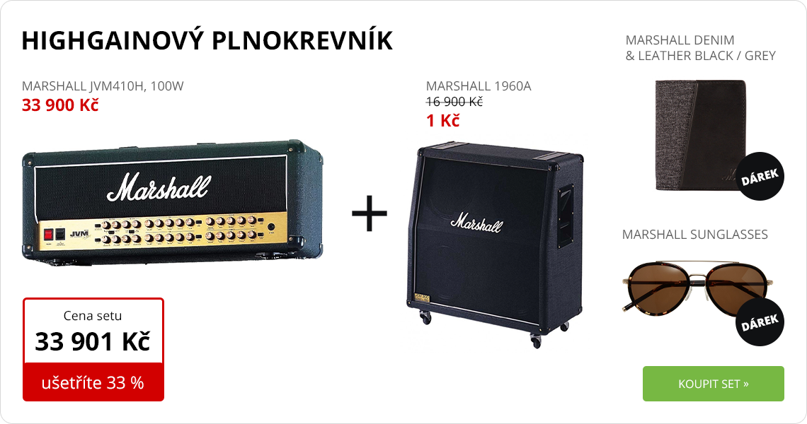 Připravili jsme pro vás bohatou nabídku zesilovačů, reproboxů, komb a lifestylových doplňků s logem Marshall. Dokonalým hitem je například kytarová hlava Marshall JVM410, ke které Vám nabídneme proslulý reprobox M 1960A za jednu jedinou korunu a k tomu přidáme řadu stylových dárků!