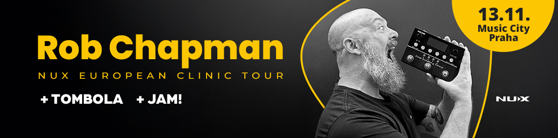 Součástí workshopu byla také prezentace produktů NUX, jejichž kytarové efekty, multiefekty a procesory Rob na svých vystoupeních používá. Vysvětlil nám také výhody bezdrátového systému NUX B-8 a prozradil, jak přistupuje k využití pedálového zesilovače NUX Trident.