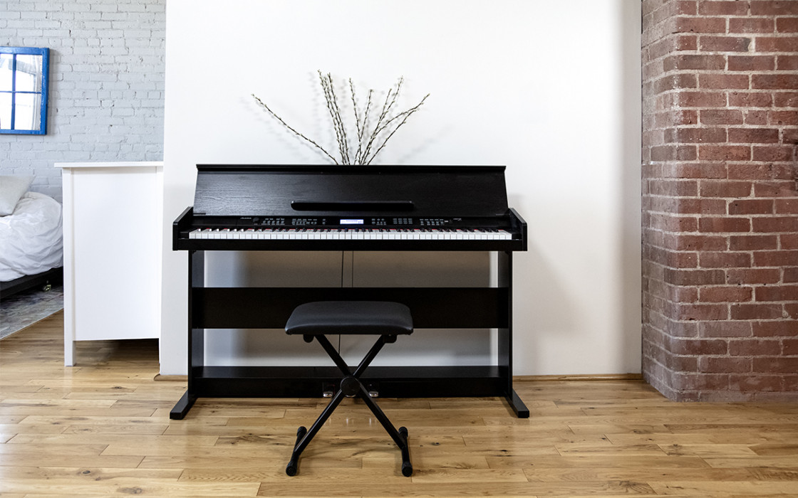 Digitální piano se stojanem a židličkou - 88 kláves s rychlostní citlivostí, 360 zvuků, polyfonie: 128 hlasů, integrovaný ozvučovací systém: 30 W (2 x 15 W), výukový mód, metronom, USB In, USB-MIDI Out, barva: Black (černá)