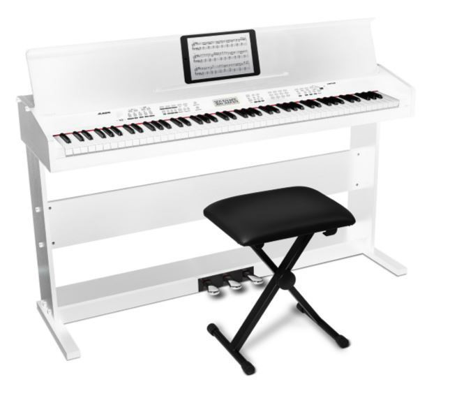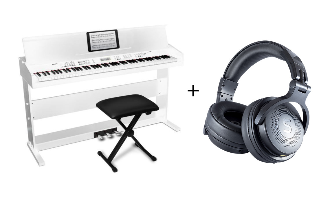 Set digitálního piana Alesis Virtue v bílé barvě se stojanem a židličkou a uzavřenými sluchátky Soundeus Fidelity 30