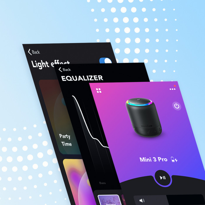 Přenosný bluetooth reproduktor, výkon: 6W, IPX7, světelná show, vydrž baterie až 15 hodin, PartyCast, nastavitelný EQ, BassUp, Soundcore App, barva: černá