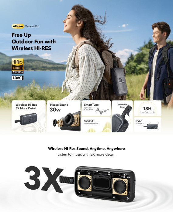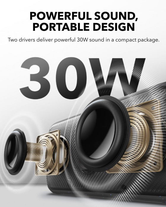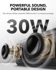 Přenosný Bluetooth stereo reproduktor, výkon: 30 W, driver: 48 mm x 2, kapacita baterie: 3350mAh/7,2V, doba nabíjení: < 4 hodin, doba přehrávání: až 13 hodin, vodotěsná úroveň: IPX7, Bluetooth: 5.3, dosah Bluetooth: 100 m