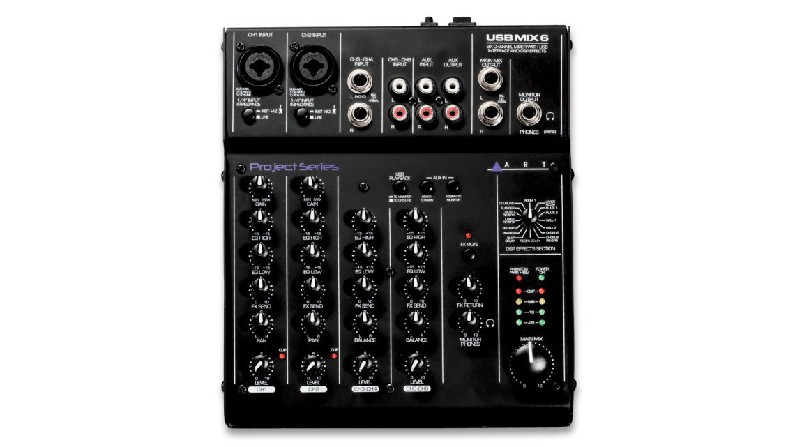 6-kanálový mix, vstupy: 2xMic/Inst/2x stereo Line, Stereo FX, USB rozhraní, phantomové napájení
