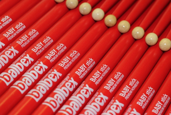 Dětské bubenické paličky, materiál: habr, délka: 330 mm, průměr: 13 mm, barva: červená, pár