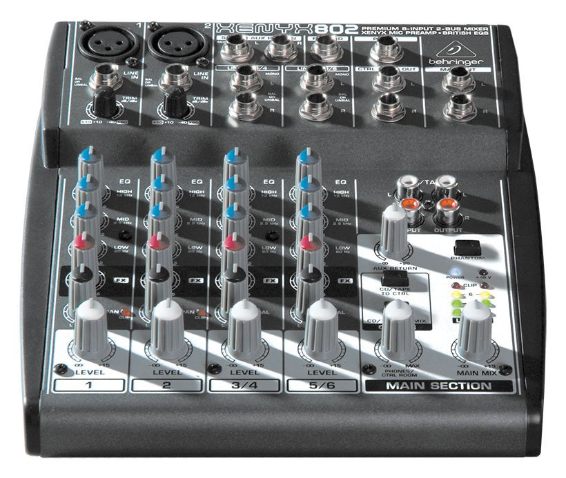 Behringer XENYX 802, malý nízko-šumový mixážní pult s pěti vstupy (2x mono a 3x stereo) je vhodný především pro domácí použití nebo malé aplikace.