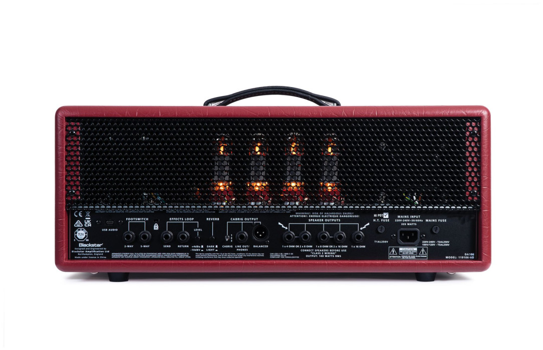 Kytarový lampový zesilovač - výkon: 100 W, elektronky: 2x ECC83 + 4x EL34, 3 kanály, Digital Reverb, efektová smyčka, Line Out / Phones, XLR DI výstup, USB Audio