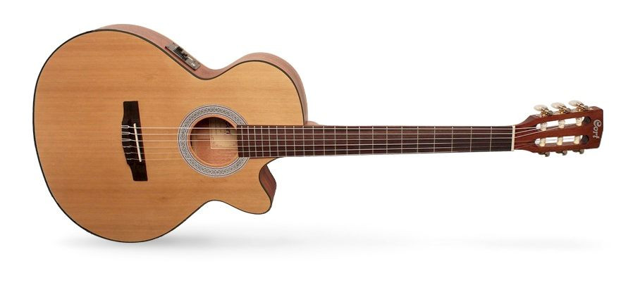 Elektro-akustická klasická kytara, top: cedr, zadní deska + luby: mahagon, krk: mahagon, hmatník: palisandr, elektronika: Cort CE304T EQ, barva: Natural