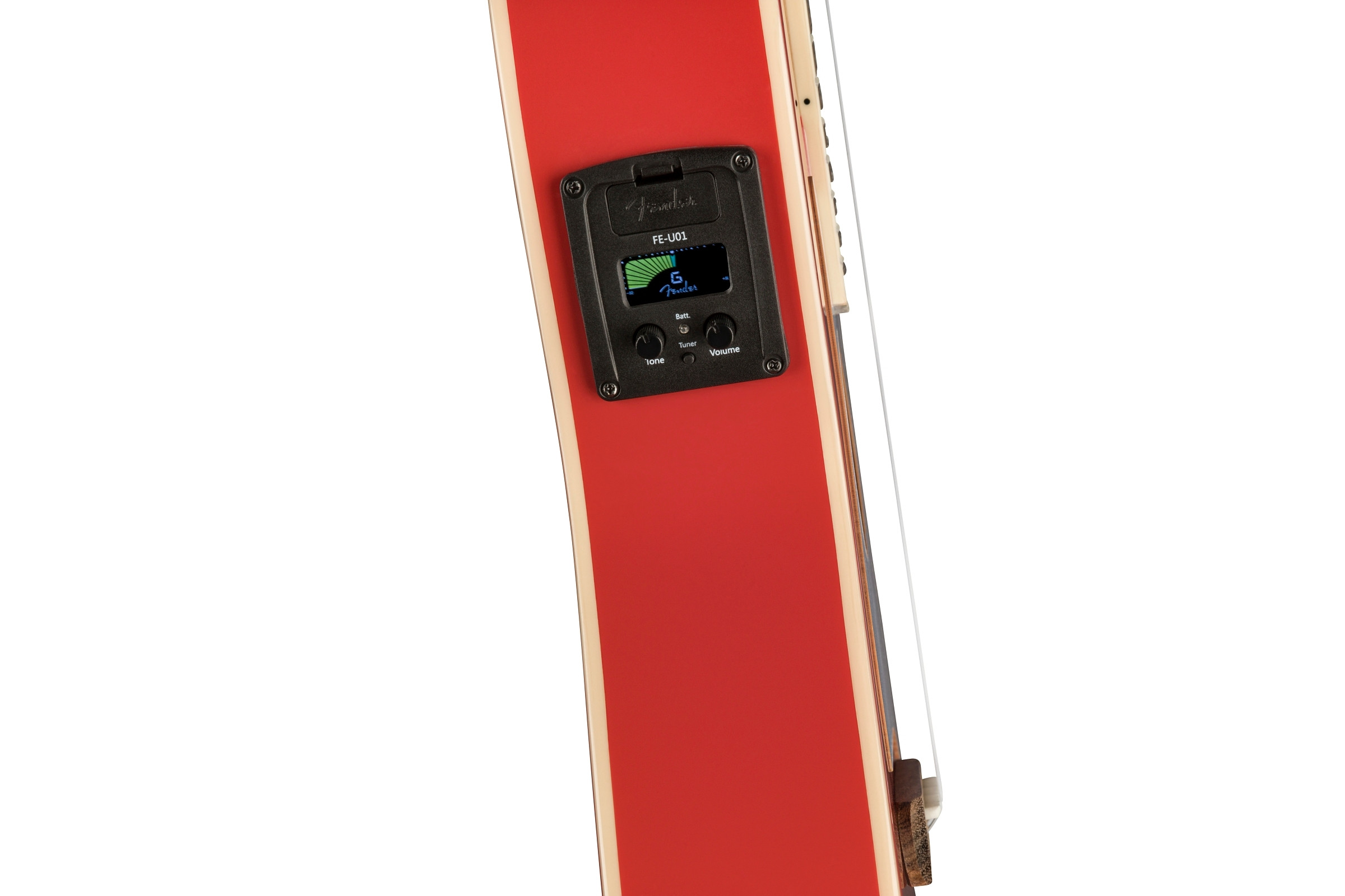 Elektroakustické ukulele - top: smrk, zadní deska + luby: mahagon, krk: javor, hmatník: ořech, elektronika: Fender FE-U01, barva: Fiesta Red