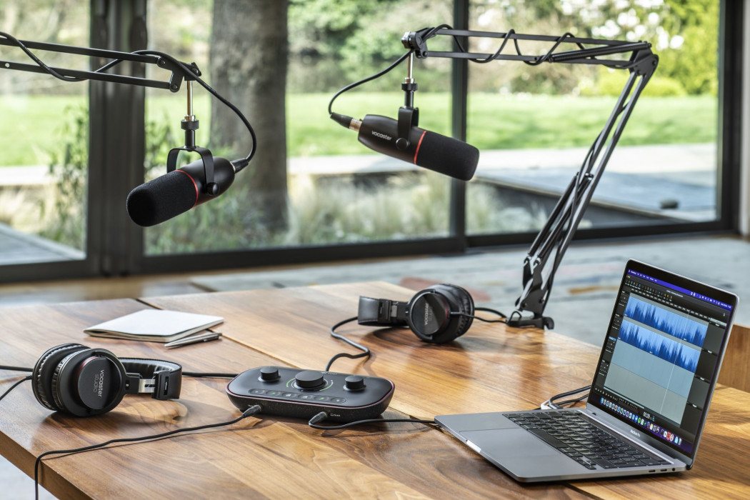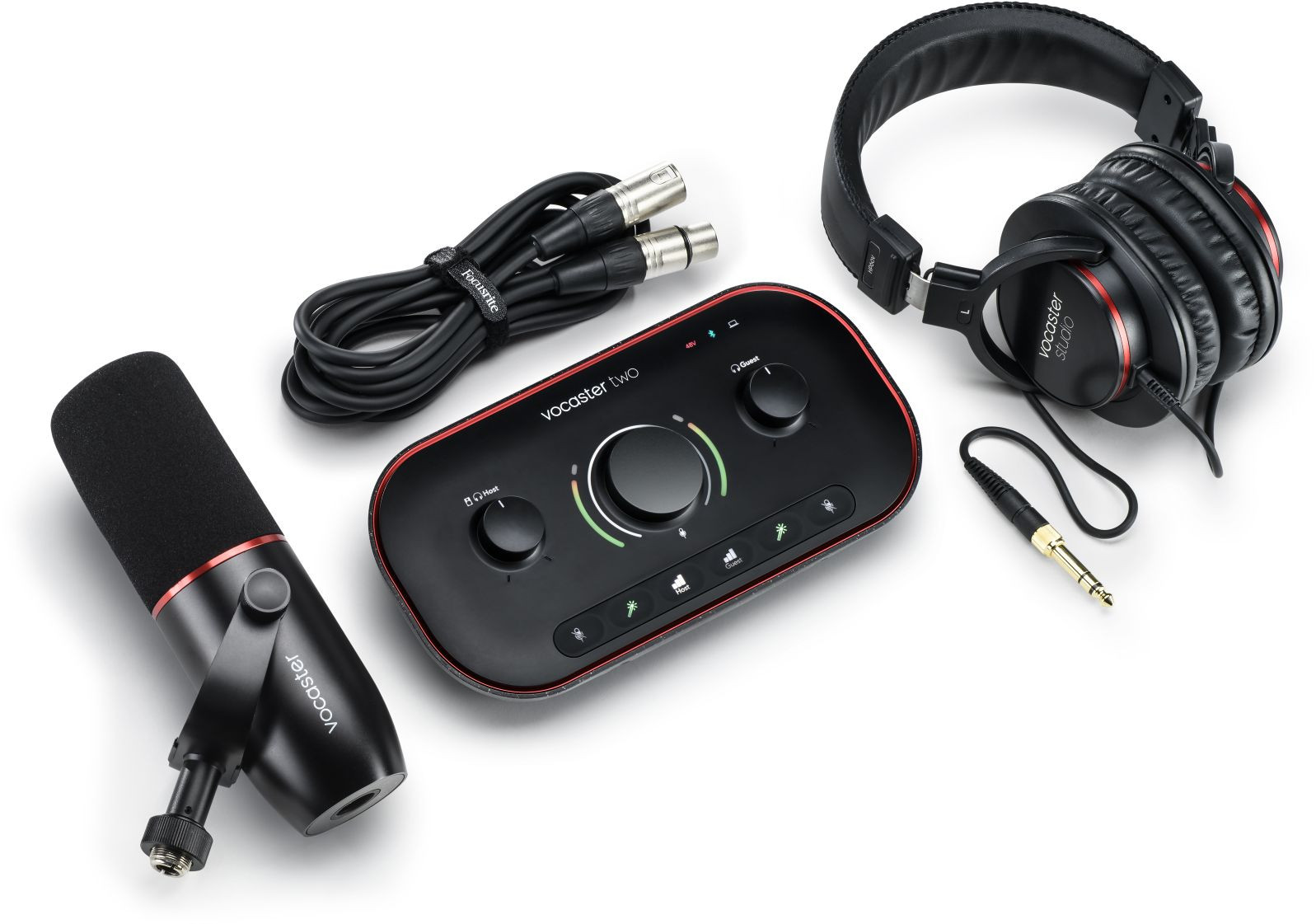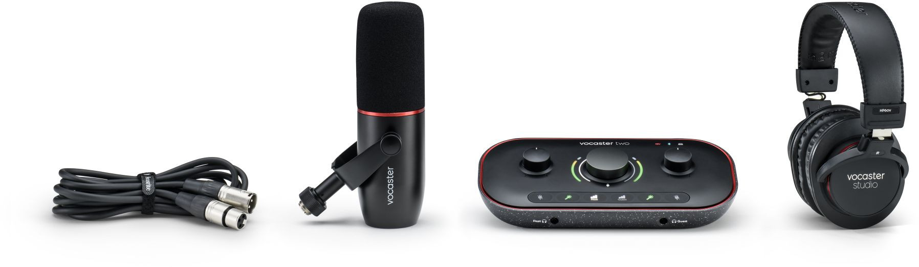 Podcastový set, 2x XLR mikrofonní vstup, 2x 1/4” symetrický výstup, 2x 1/4” sluchátkový výstup, 1x 3.5mm TRRS konektor pro telefony, 1x 3.5mm TRS kamerový výstup, USB-C, balení obsahuje: Vocaster One, mikrofon Vocaster DM14v, sluchátka HP60v, 3m XLR kabel, USB A-C kabel