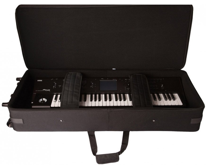 Lehký přepravní kufr s vnitřními rozměry: 1092,2 x 444,5 x 165,1 mm, určené pro přepravu klávesových nástrojů, teleskopické madlo, kolečka, polstrování 20 mm