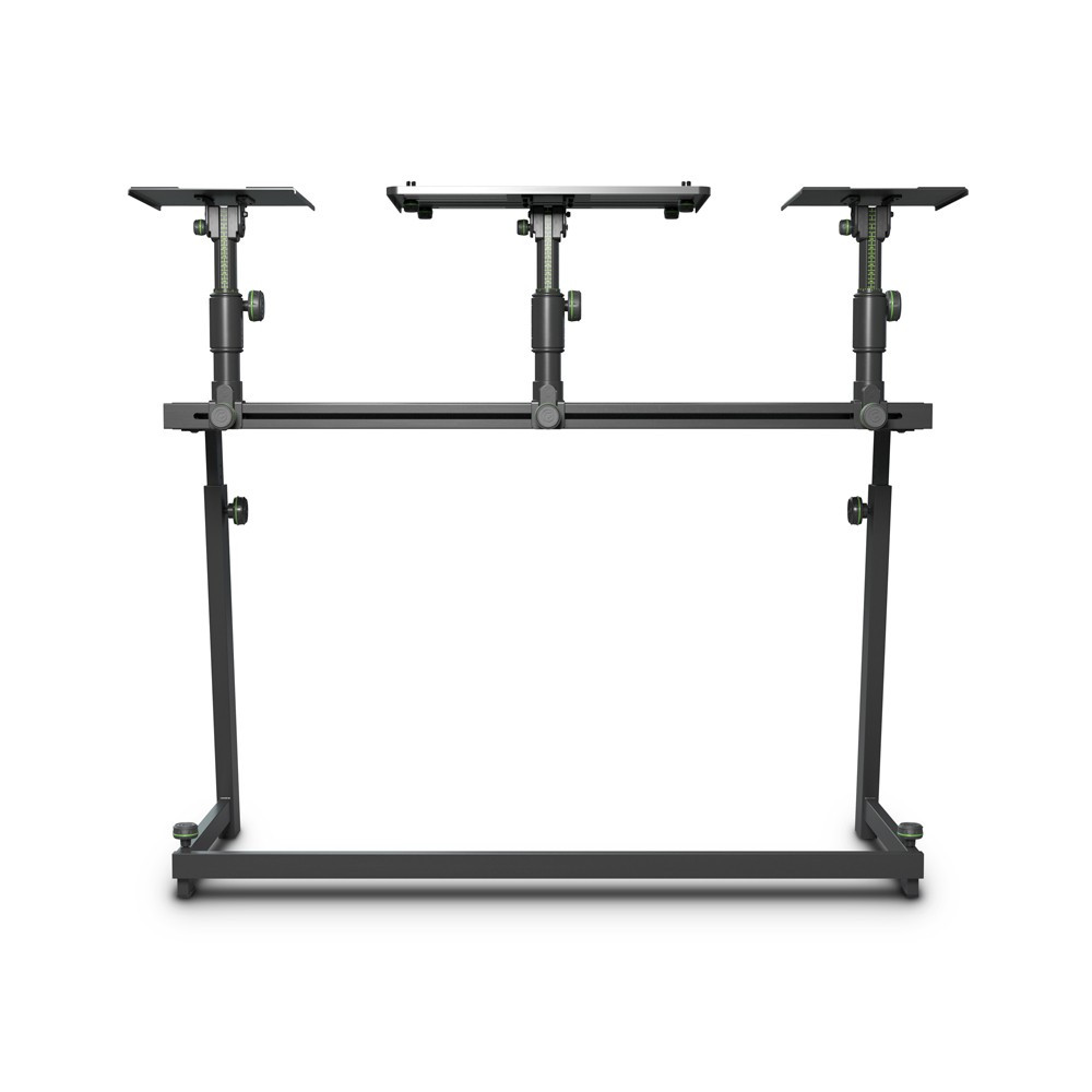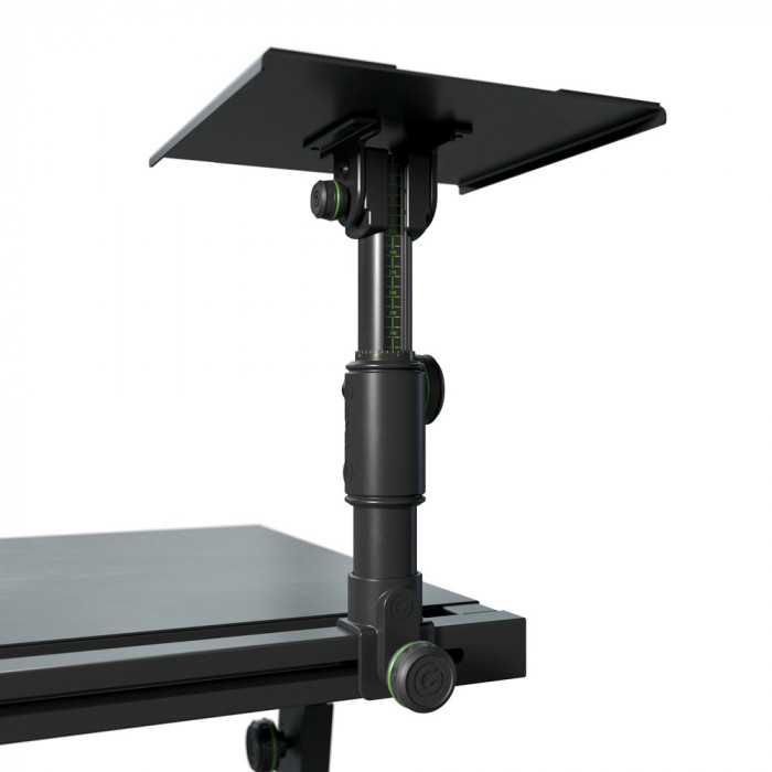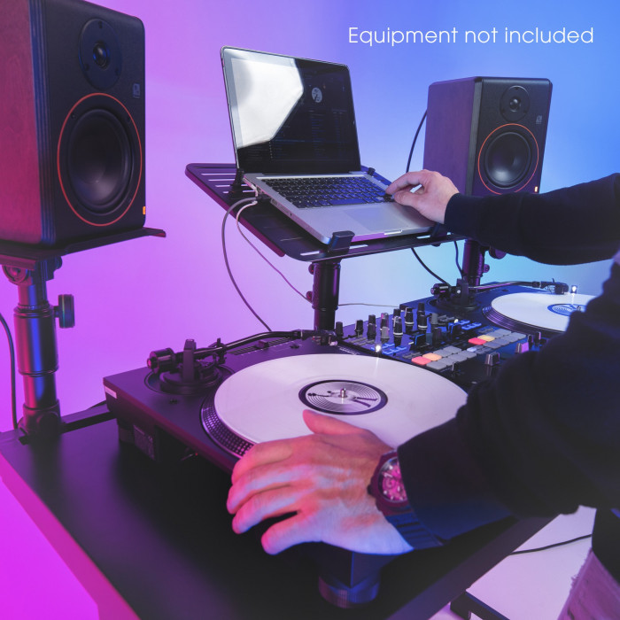 DJ-stůl s flexibilním reproduktorovým držákem a stojanem pro notebook, materiál: ocel, max. zatížení: 50 kg, max. zatížení přihrádky reproduktoru: 15 kg, hmotnost: 24 kg
