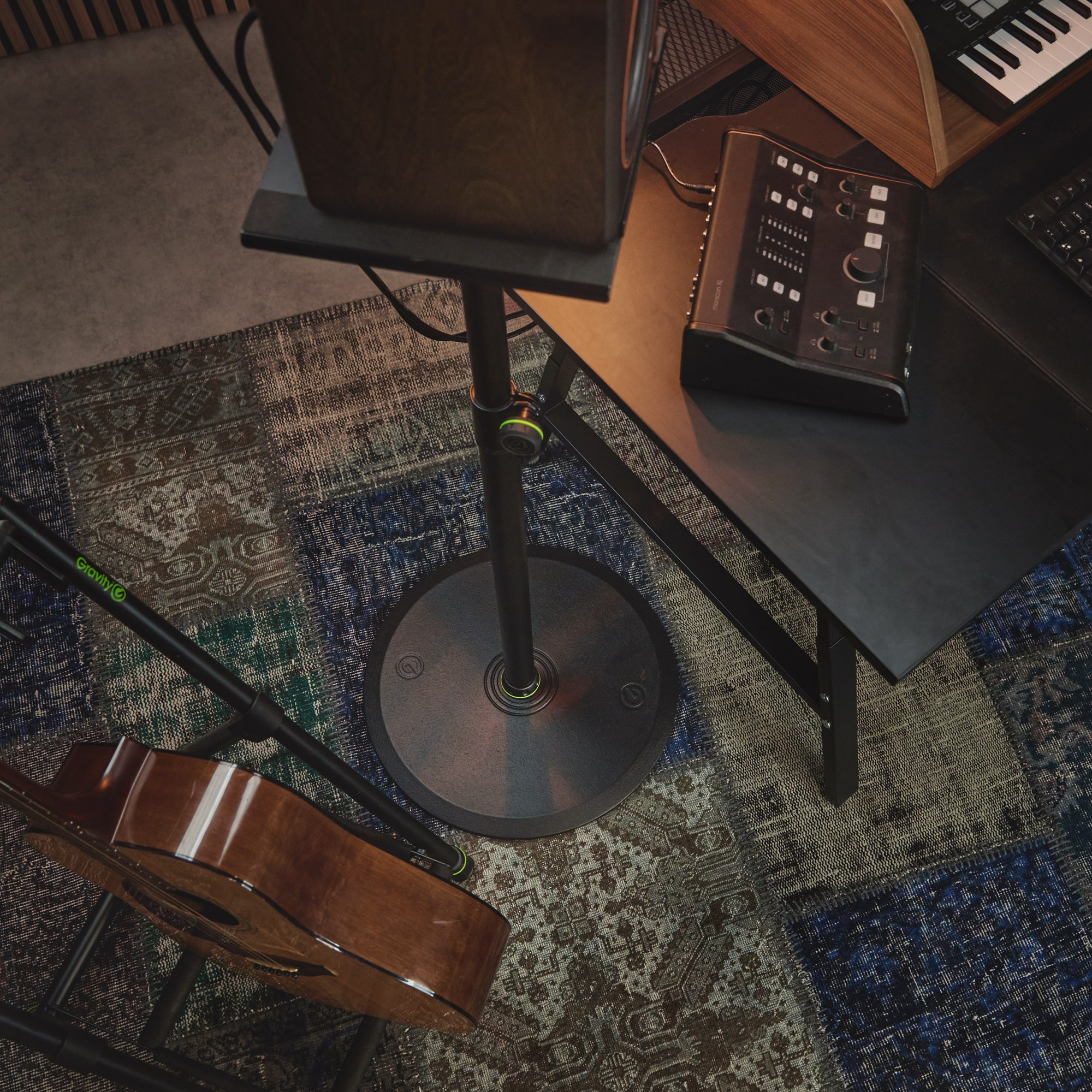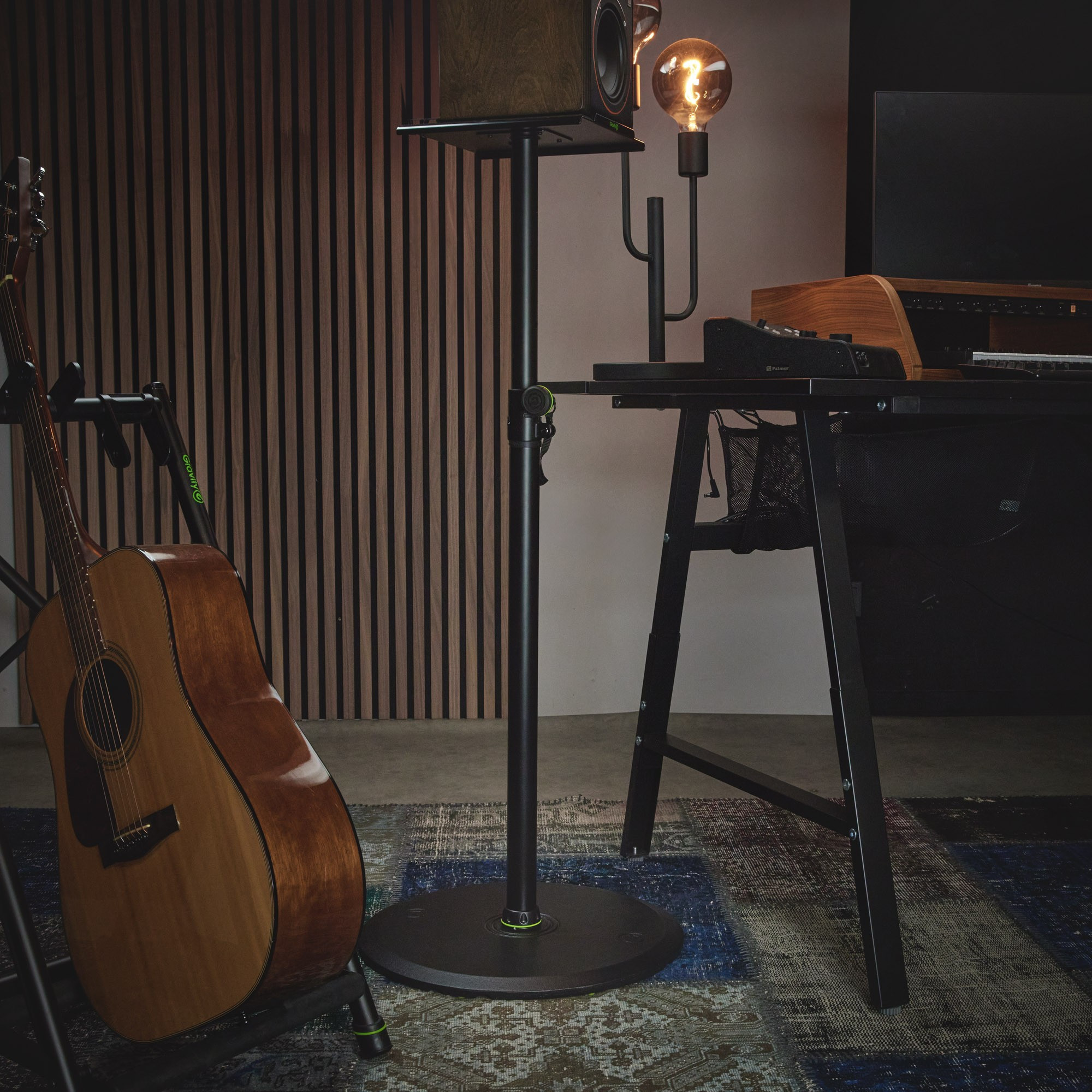 Stojan na studiový monitor s velkou kulatou základnou, výška: 860 mm - 1500 mm, průměr základny: 450 mm, nosnost 40 kg
