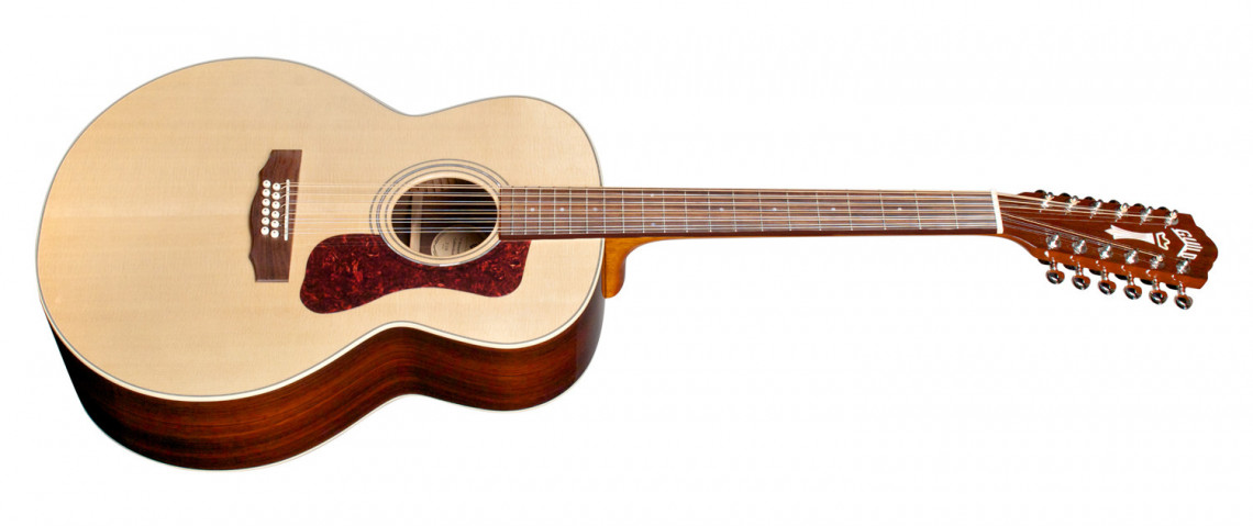 Dvanáctistrunná elektroakustická kytara, série: Guild Acoustic Design, tvar: jumbo, přední deska: masivní smrk, zadní deska a luby: masivní palisandr, krk: mahagon, hmatník: palisandr, snímací systém: Fishman Sonitone, kufr součástí balení, barva: Natural