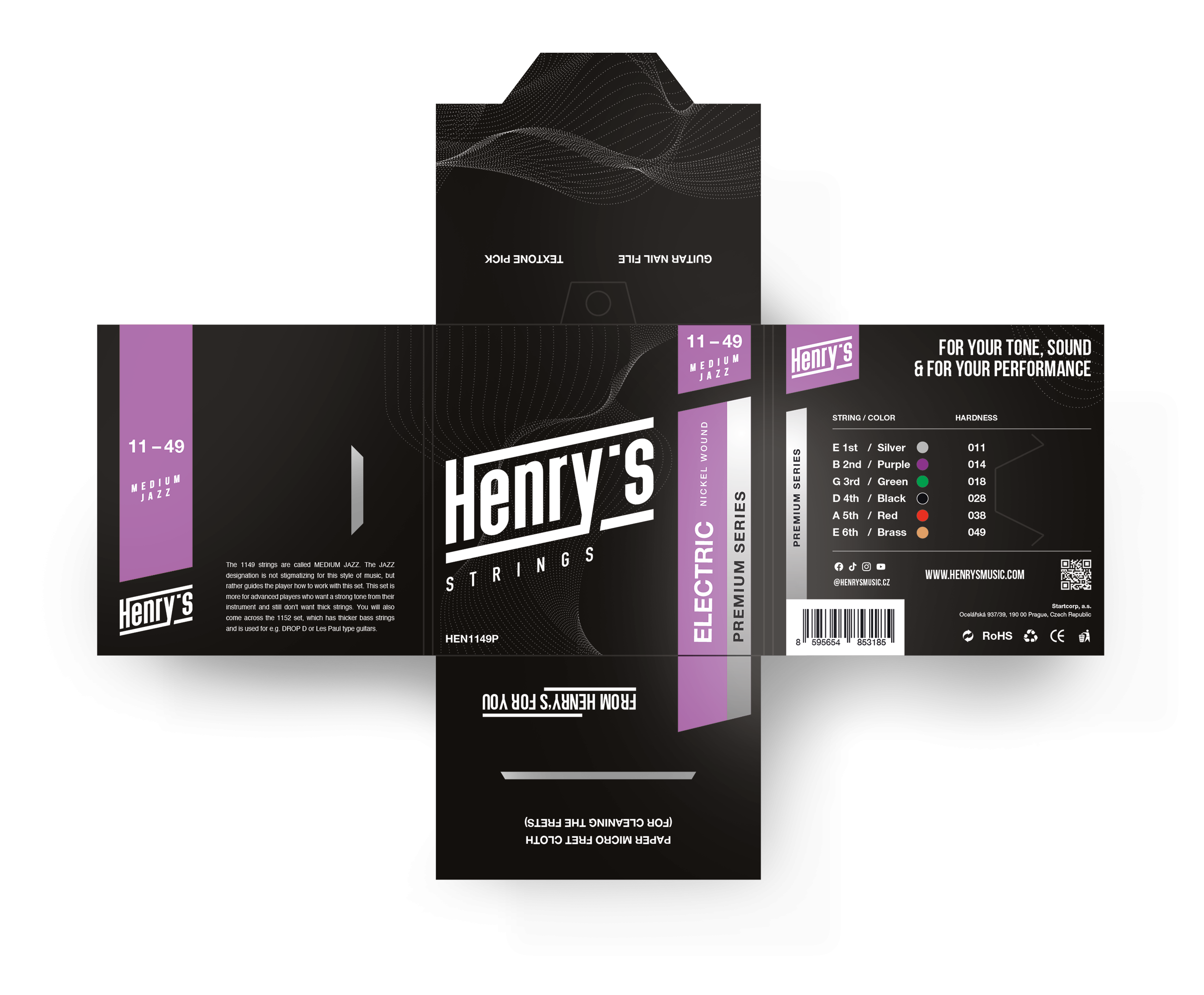 Struny pro elektrickou kytaru - tvrdost: .011 - .049, vinutí: válcové, materiál: poniklovaná ocel, jádro: ocelové, zakončení: kulička (Ball End). Premium rozkládací obal, obsahující trsátko, pilníček na nehty, čistič pražců, edukační texty.