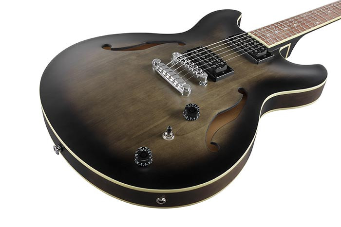 Elektrická semiakustická kytara, série: Artcore, tělo: lípa, krk: nyatoh, hmatník: ořech, snímače: 2x Ibanez Infinity R, barva: Transparent Black Flat