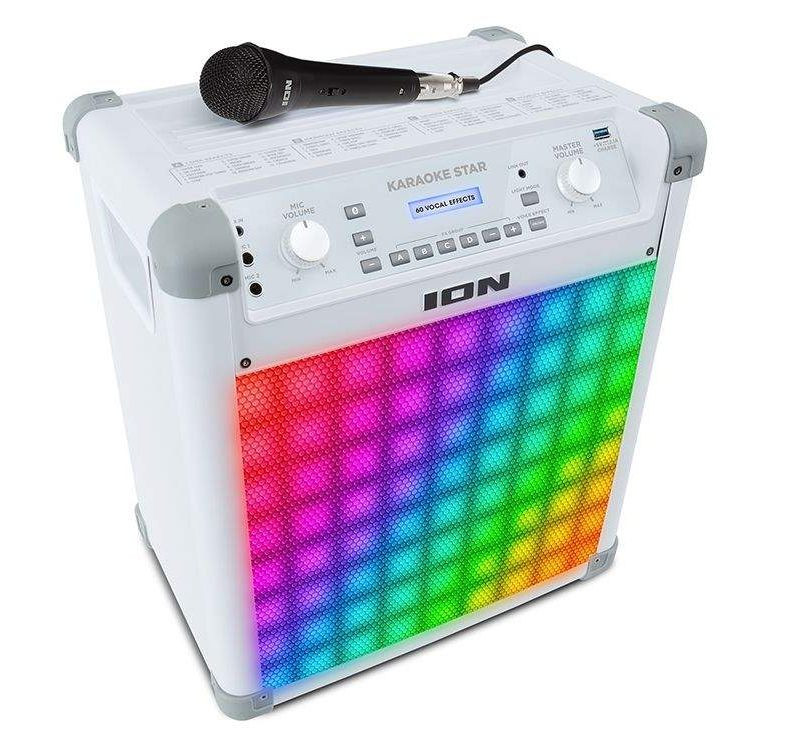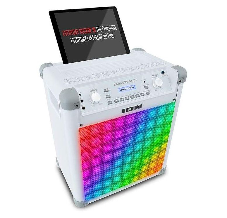 Bezdrátový přenosný karaoke reproduktor s mikrofonem a vokálními efekty, výkon: 50 W, vstupy: Jack 3,5 mm TRS, 2x Jack 6,3 mm TS, USB, výstup: Jack 3,5 mm TRS, barva: bílá