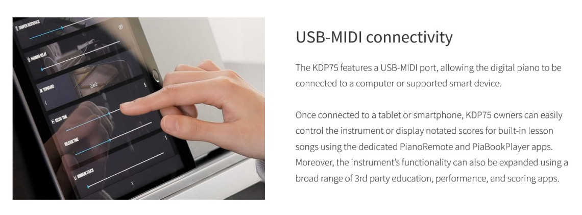 Digitální piano - 88 kláves (kladívková klaviatura, plně vyvážená), 200 zvuků, 100 rytmů, 60 demo skladeb, polyfonie: 128 hlasů/256 MBit, funkce Record/Play, USB, MIDI, Bluetooth, sluchátkový...