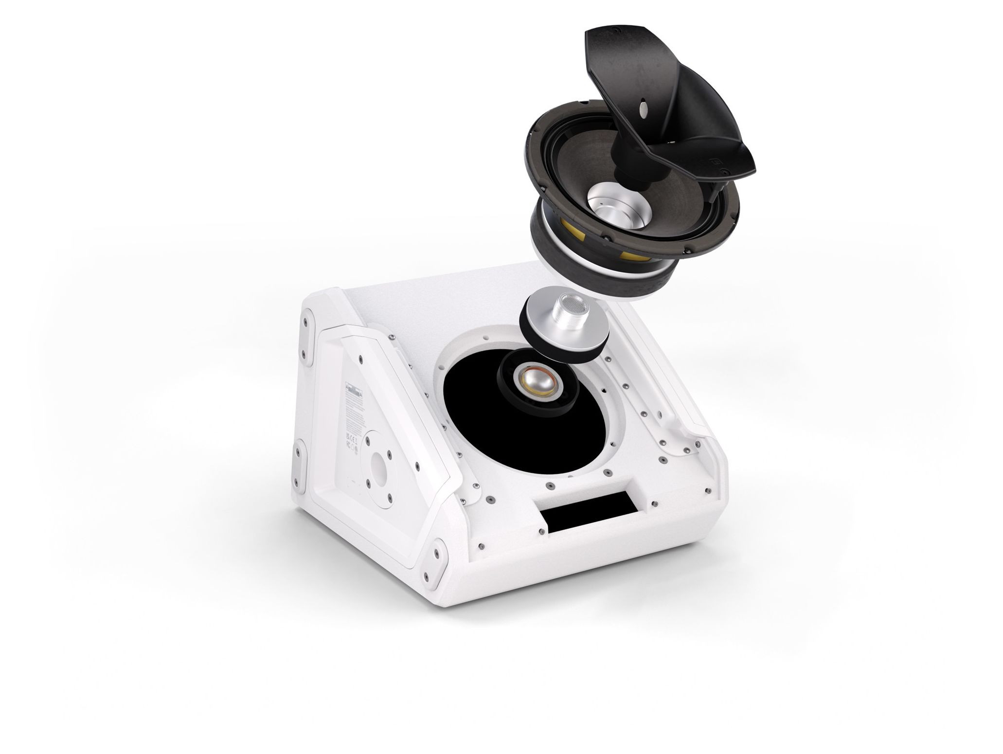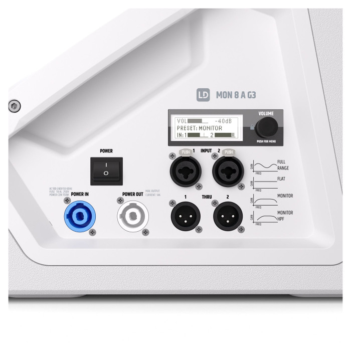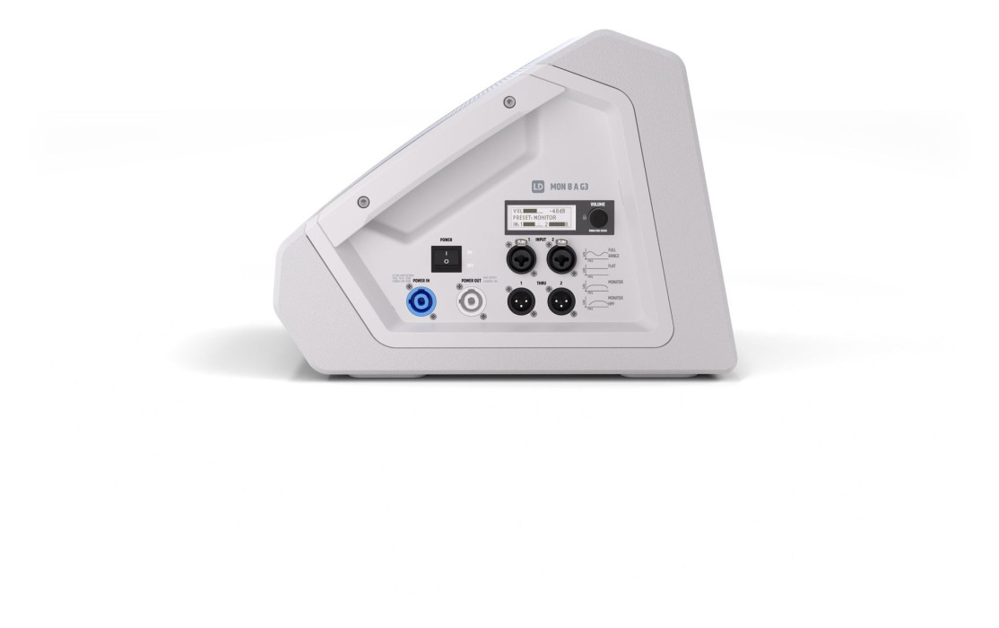 Aktivní pódiový monitor, zesilovač třídy D, výkon: 300 W RMS/1200 W Peak, max. 121 dB. SPL, repro: 8" basový reproduktor s 2,5" kmitací cívkou, barva: bílá