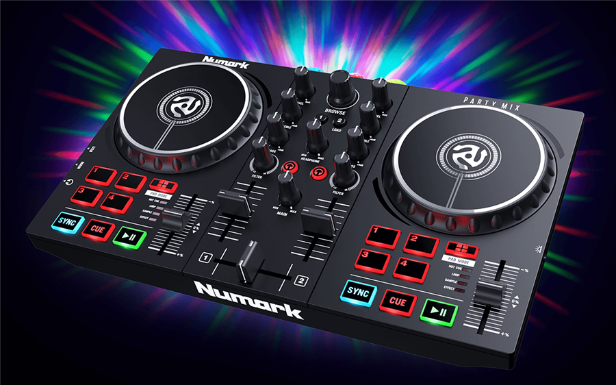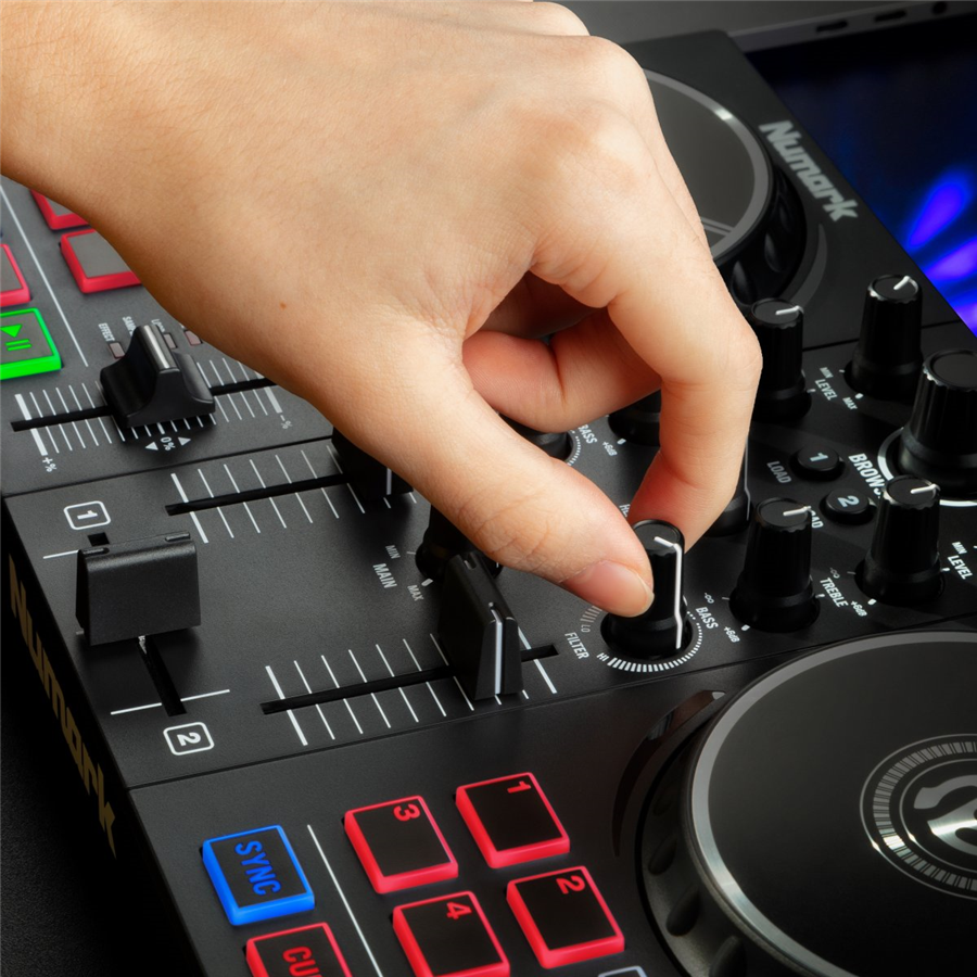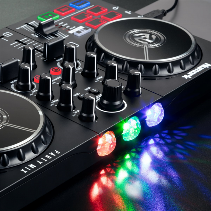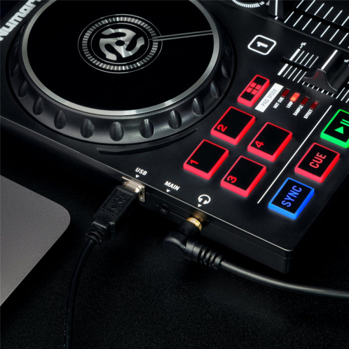 DJ kontroler, 2-kanály, dotykové jog plotny, 2pásmový ekvalizér, osvětlené pady, světelné LED diody, podpora DJ aplikací a streamovacích služeb