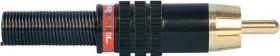 Konektor RCA samec pro montáž na kabel, stříbrné kovové pouzdro s černým proužkem, pájecí
