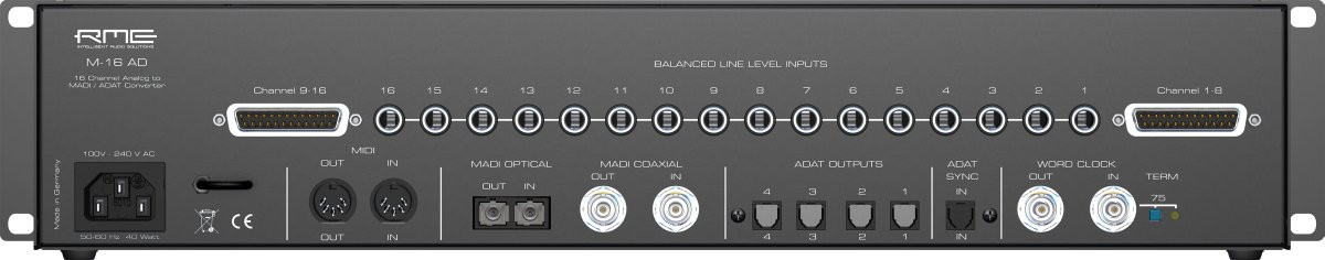 16-kanálový AD převodník, převod analogového signálu do digitálního formátu MADI nebo ADAT, rackové provedení, výška 2U, 1 × MADI vstup / výstup, 4 × ADAT výstup, analogový limiter, 16 pětistupňových LED indikátorů úrovně