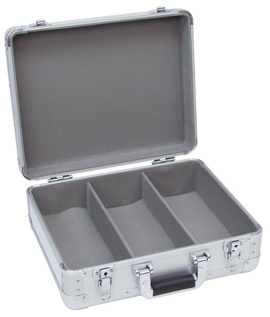 Atraktivní robustní aluminiový kufr na 90 CD stříbrný. Možnost univerzálního použití na mikrofony, kabely, nářadí, osobní věci, drobnosti apod. Dva postranní uzamykatelné zámky, výklopné madlo pro přenášení, zakulacené ochranné rohy. Uvnitř rozdělený vyjímatelnými přepážkami na tři části. Velmi kvalitní provedení. Vnitřní rozměr: 400 x 320 x 150 mm.