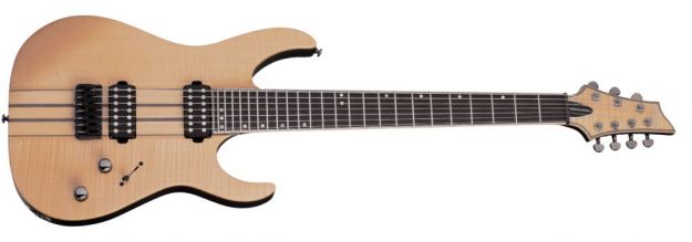 Sedmistrunná elektrická kytara, tělo: bahenní jasan, top: topol, krk: javor / ořech, hmatník: eben, snímače: 2x Schecter Diamond Decimator, barva: Satin Charcoal Burst