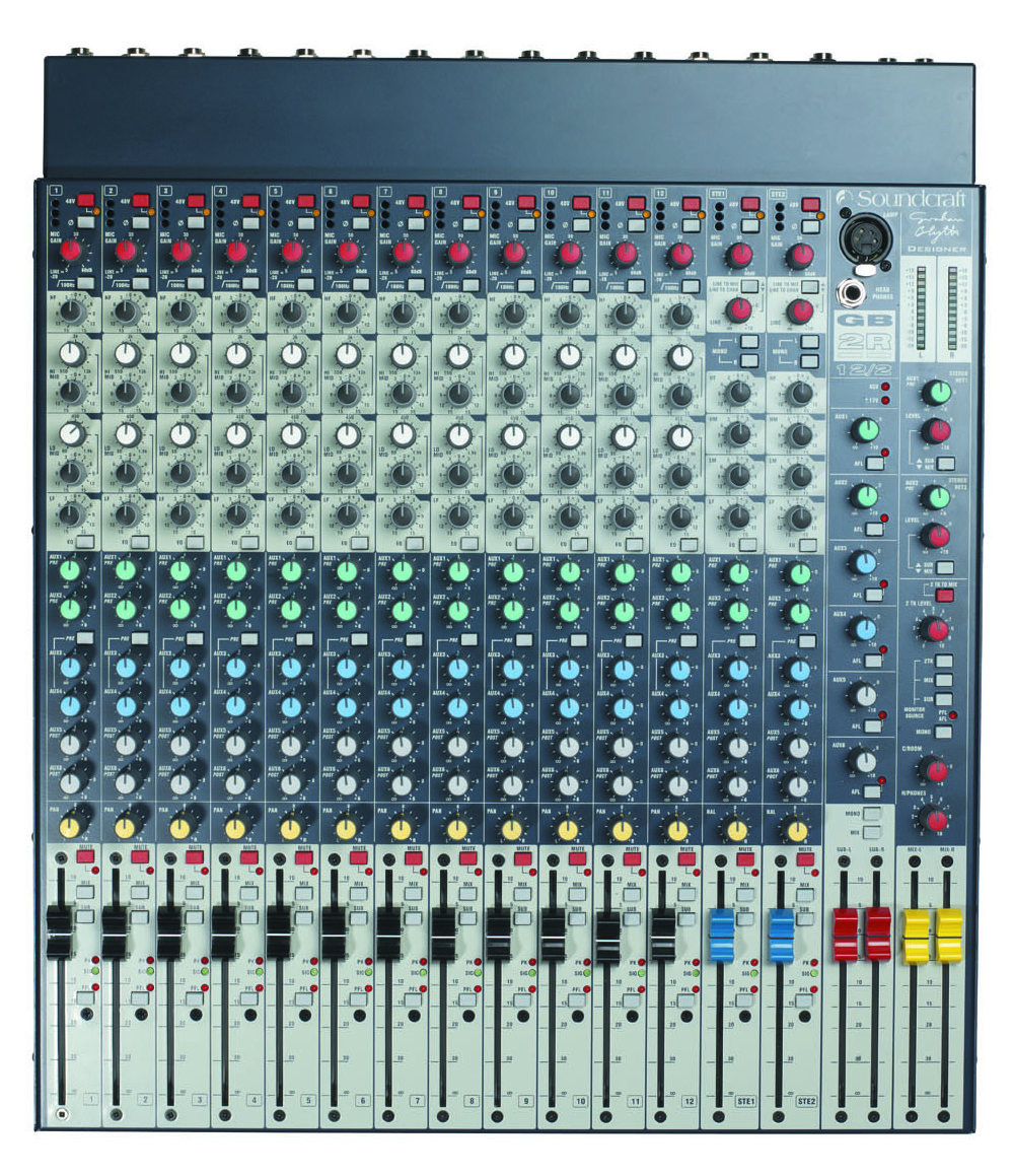 Mixážní pult pro FOH, monitoring i studio, GB2R série, 16 kanálů, 16x mikrofonní vstup, 2x stereo vstup, 4 pásmový EQ s laditelnými středy, 6x Aux, 2x podskupina, špičkové mikrofonní předzesilovače, sluchátkový výstup, otočný konektorový panel, 19“ rack
