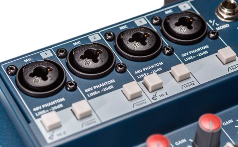 • Kanál 1: hi-pass filtr (100 Hz), třípásmový ekvalizér (LF 80 Hz, MF 2,5 kHz, HF 12 kHz), Přepínač citlivosti Hi-Z, Gain, AUX/FX, Pan, Level