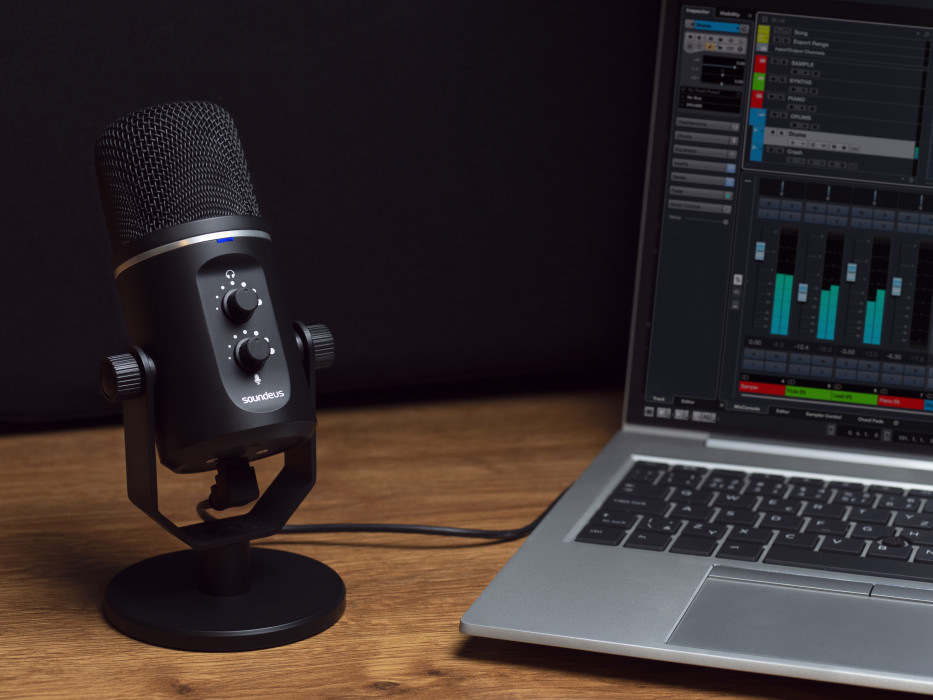 Stolní USB mikrofon s přepínatelnou směrovou charakteristikou, ovládání citlivosti mikrofonu, sluchátkový výstup, Plug&Play připojení pro Mac i PC, integrovaný stojánek