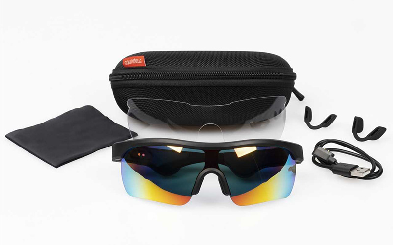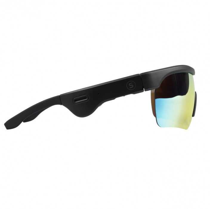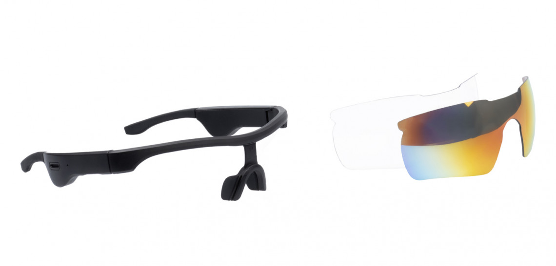 Sportovní brýle se zabudovanými reproduktory typu open-ear audio, duální integrovaný mikrofon s funkcí potlačení okolního hluku, handsfree mód pro tel.hovory a hlasovou navigaci, voděodolné, vyměnitelný polykarbonátový zorník, čirý zorník v balení, automatické zapínání roztažením nožiček brýlí, doba přehrávání až 5h na jedno nabití.