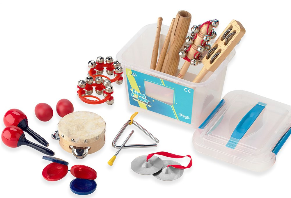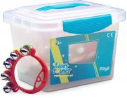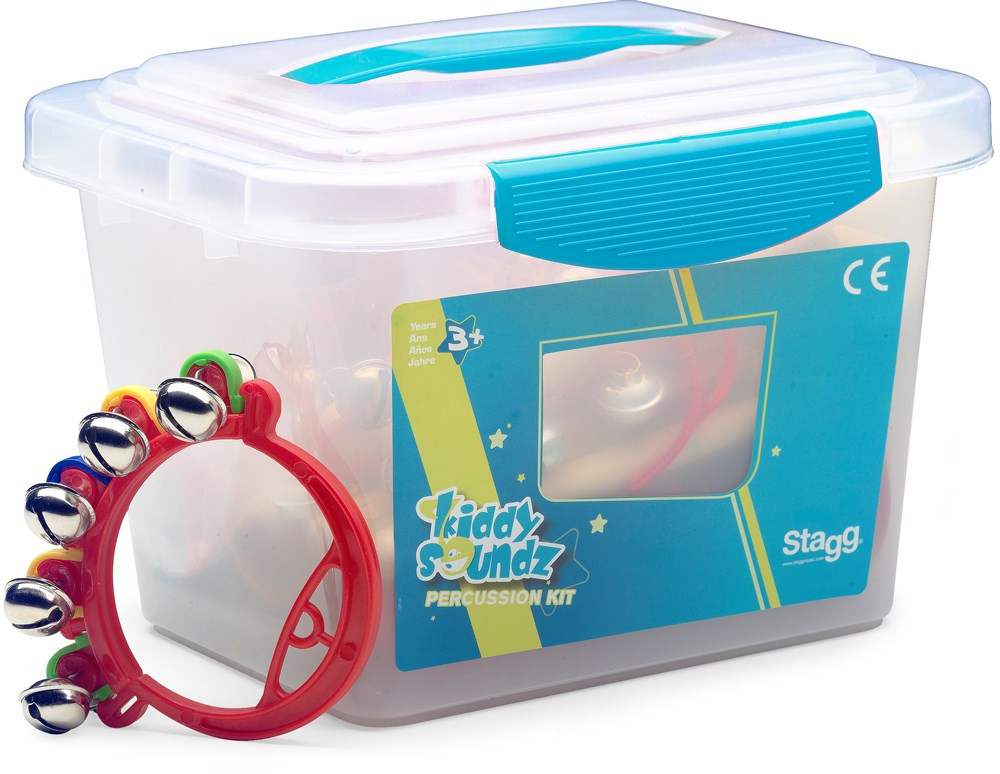 Dětská perkusní sada s 11 hudebními nástroji. Hmotnost 1,3 kg. Pro děti od 3 let. Plastový box s víkem.