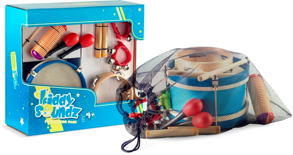 Dětská perkusní sada s 6 hudebními nástroji. Pro děti od 3 let. Uložení v síťovém vaku.