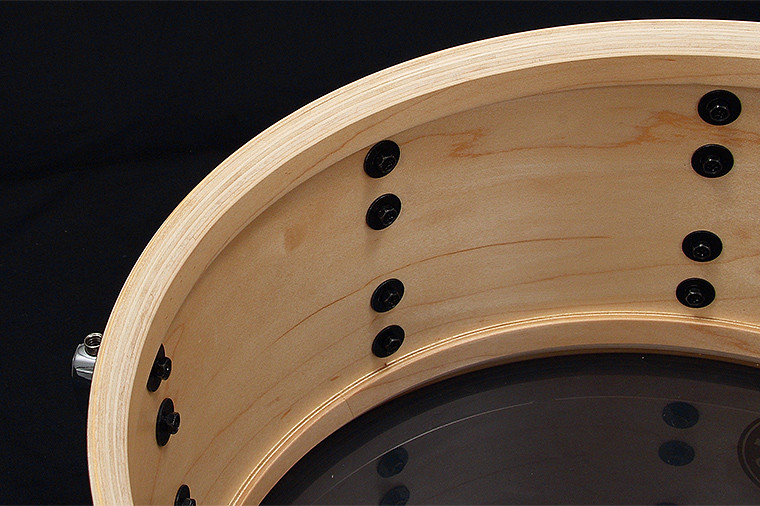 Snare drum serie S.L.P. - Sound Lab Project, 14" × 6,5", korpus: javor (6 vrstev, tloušťka 5 mm se zpevňujícími prstenci), ráfky: javorové Maple Wood Hoop, ladící šrouby: 10 na straně, povrch mechaniky: chrom, barva: Sienna