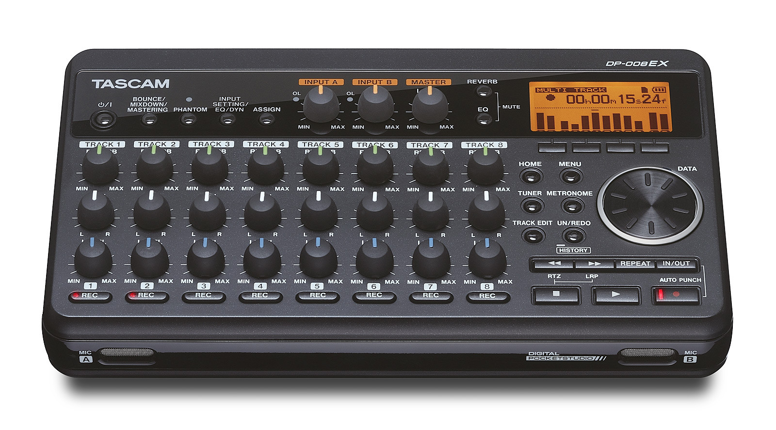 B-stock: vybalené, vystavené zboží * Tascam DP-008EX, Osmistopý SD/ SDHC rekordér, podporovaná kapacita karet: až 32 GB, nahrávání: 44,1 kHz/ 16 bit, 2 integrované kondenzátorové mikrofony s všesměrovou charakteristikou, vstupy pro linku a externí mikrofony, nástrojový vstup, sluchátkový / linkový výstup, efekty, dvoupásmový EQ pro každou stopu, integrovaná chromatická ladička, metronom, miniUSB konektor, podsvětlený display, možnost bateriového napájení