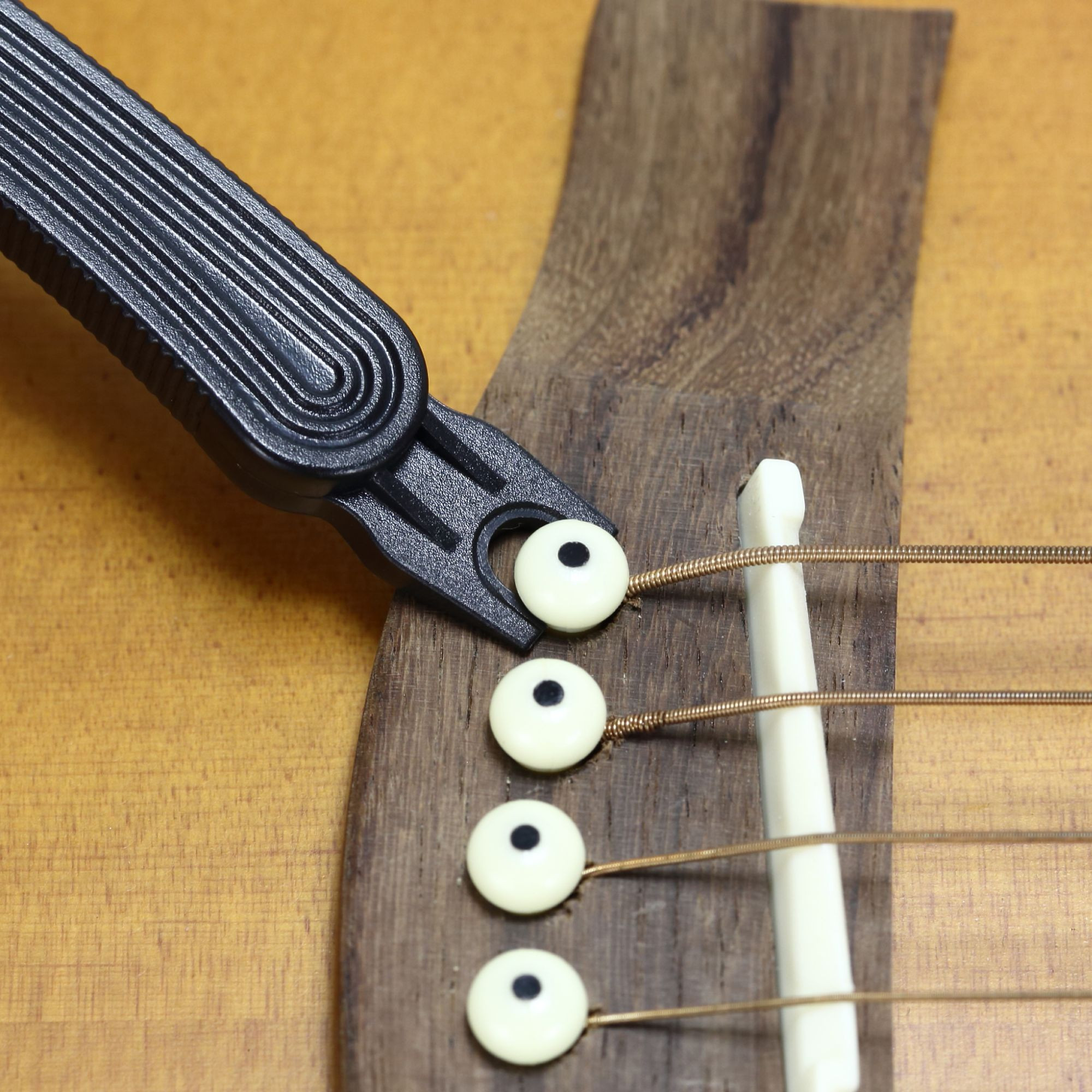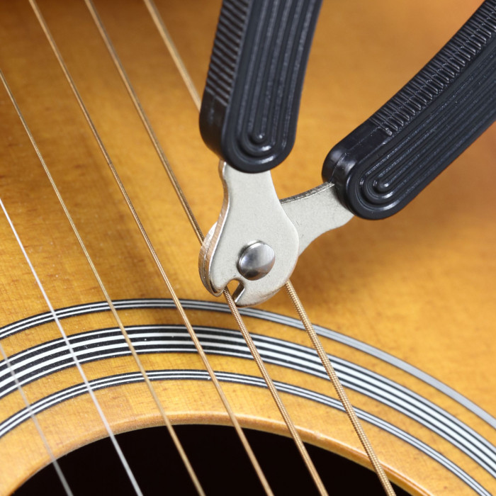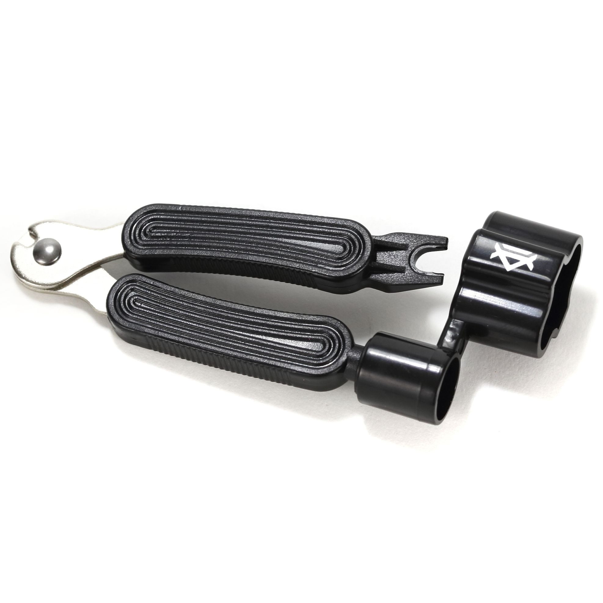 Nástroj pro výměnu strun, kombinuje ocelový řezač strun, vytahovač kolíků pro akustické nástroje a navíječ strun