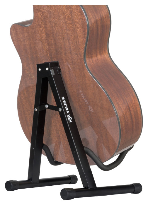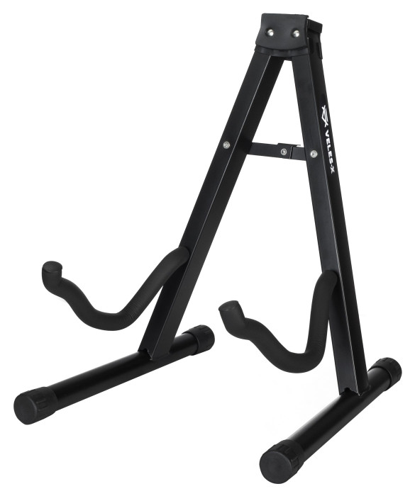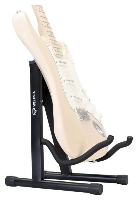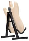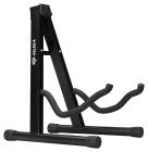 Skládací kytarový stojan na cesty, stage i do studia, velmi lehký, ergonomický tvar, vypolstrované dotykové body, možný náklon stojanu a přizpůsobení nerovným povrchům, barva: černá