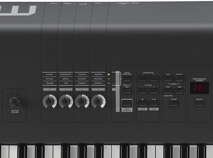 Syntezátor - 88 kláves, kladívková mechanika, polyfonie: 128 hlasů, počet zvuků: 1106 Normal Voices + 61 Drum Kits (GM: 128 Normal Voices + 1 Drum Kit, User: 128 Normal Voices + 8 Drum Kits)