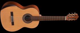 Klasická kytara se snímačem - top: smrk (masiv), zadní deska + luby: hardwood, krk: javor, hmatník: palisandr, elektronika: Fishman Presys, barva: černá, popis závady: propadlá vrchní deska