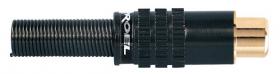RCA samice pro montáž na kabel, černé kovové pouzdro, pájecí
