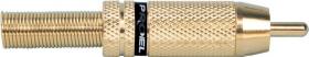 Konektor RCA samec pro montáž na kabel, pozlacené kontakty, černé kovové pouzdro s černým proužkem, pájecí