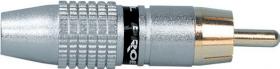 Konektor RCA samec pro montáž na kabel, stříbrné kovové pouzdro s černým proužkem, pájecí